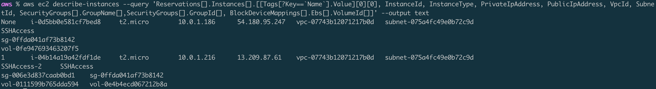 aws ec2 describe-instances --query 'Reservations[].Instances[].[[Tags[?Key==`Name`].Value][0][0], InstanceId, InstanceType, PrivateIpAddress, PublicIpAddress, VpcId, SubnetId, SecurityGroups[].GroupName[],SecurityGroups[].GroupId[], BlockDeviceMappings[].Ebs[].VolumeId[]]' --output text