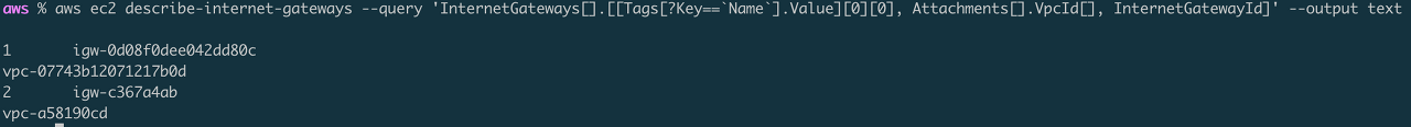 aws ec2 describe-internet-gateways --query 'InternetGateways[].[[Tags[?Key==`Name`].Value][0][0], Attachments[].VpcId[], InternetGatewayId]' --output text
