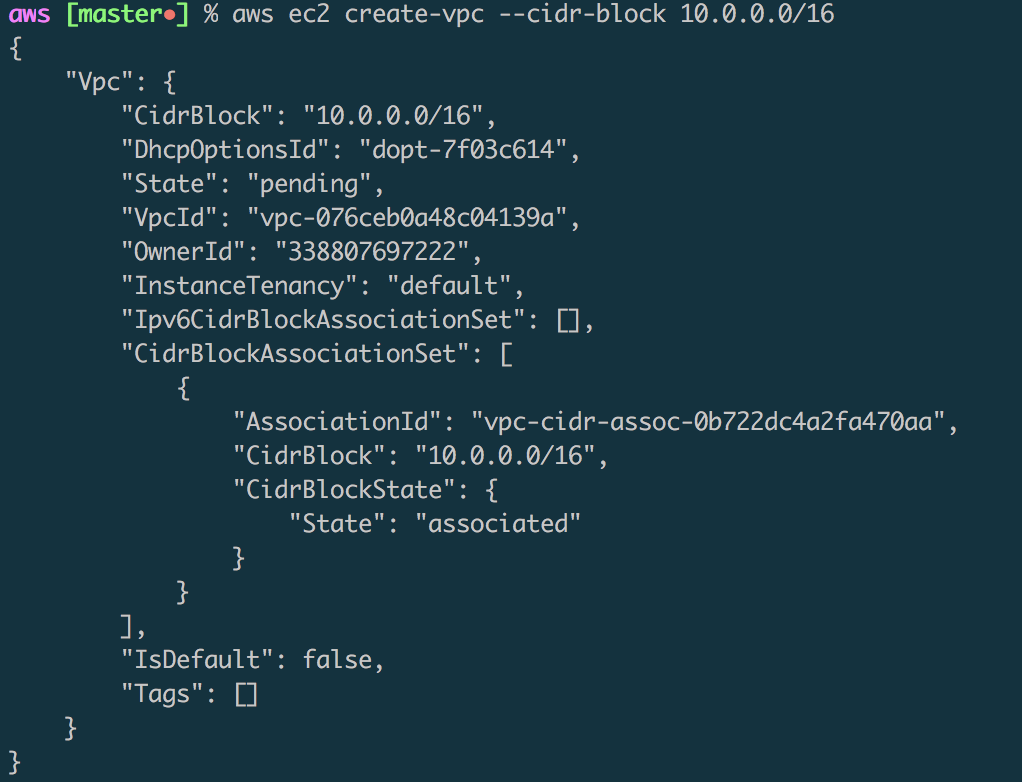 aws ec2 create-vpc --cidr-block 10.0.0.0/16