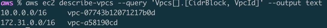 aws ec2 describe-vpcs --query 'Vpcs[].[CidrBlock, VpcId]' --output text