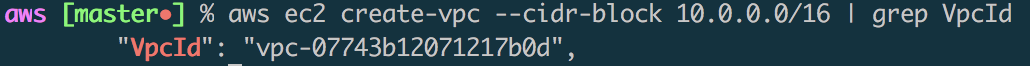 aws ec2 create-vpc --cidr-block 10.0.0.0/16 | grep VpcId