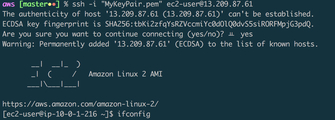 ssh -i "MyKeyPair.pem" ec2-user@13.209.87.61