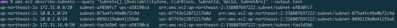 aws ec2 describe-subnets --filters "Name=vpc-id,Values=vpc-07743b12071217b0d" --query 'Subnets[*].{ID:SubnetId,CIDR:CidrBlock}'