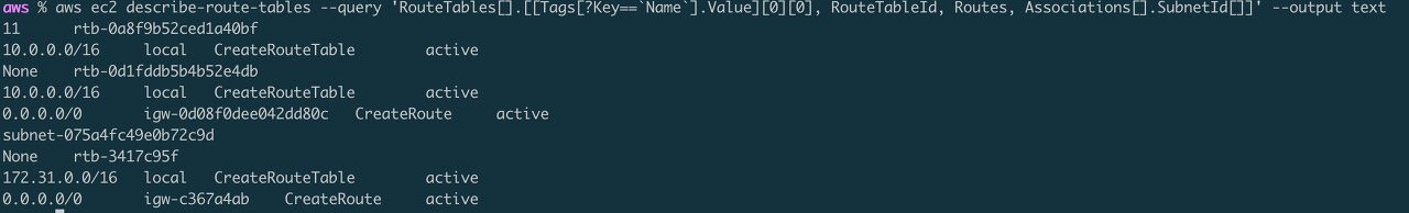 aws ec2 describe-route-tables --query 'RouteTables[].[[Tags[?Key==`Name`].Value][0][0], RouteTableId, Routes, Associations[].SubnetId[]]' --output text